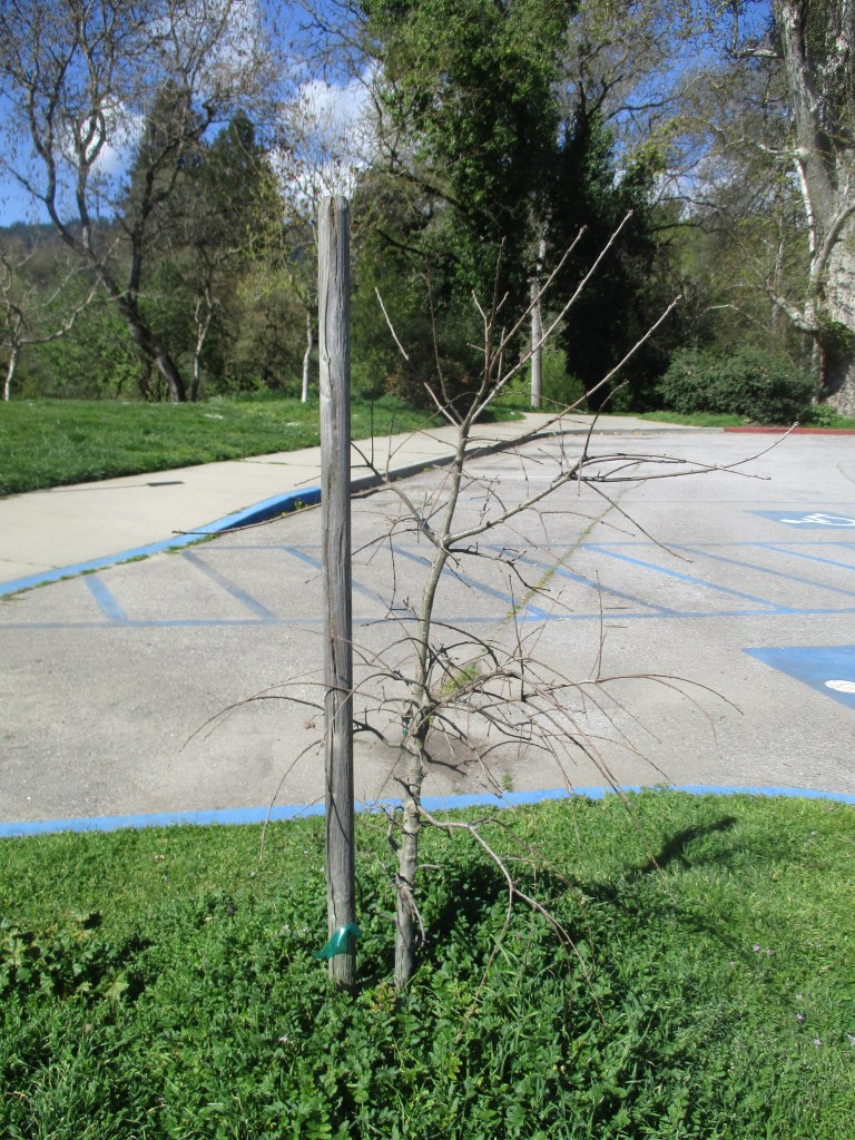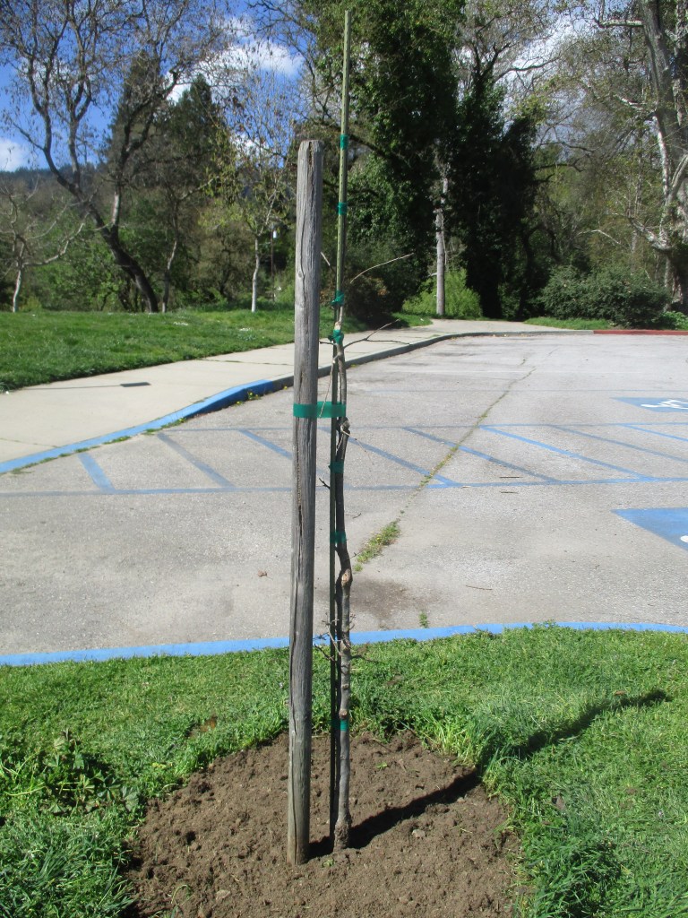 If it continues with the healthy growth it exhibited after a seemingly slow start last year, the still small Memorial Tree of Felton Covered Bridge Park should be happy now, in its fifth season. It was pruned, groomed and relieved of weeds last Friday. Its first dose of fertilizer will be applied today, before fresh new foliage starts to develop. New binding should remain until autumn.
