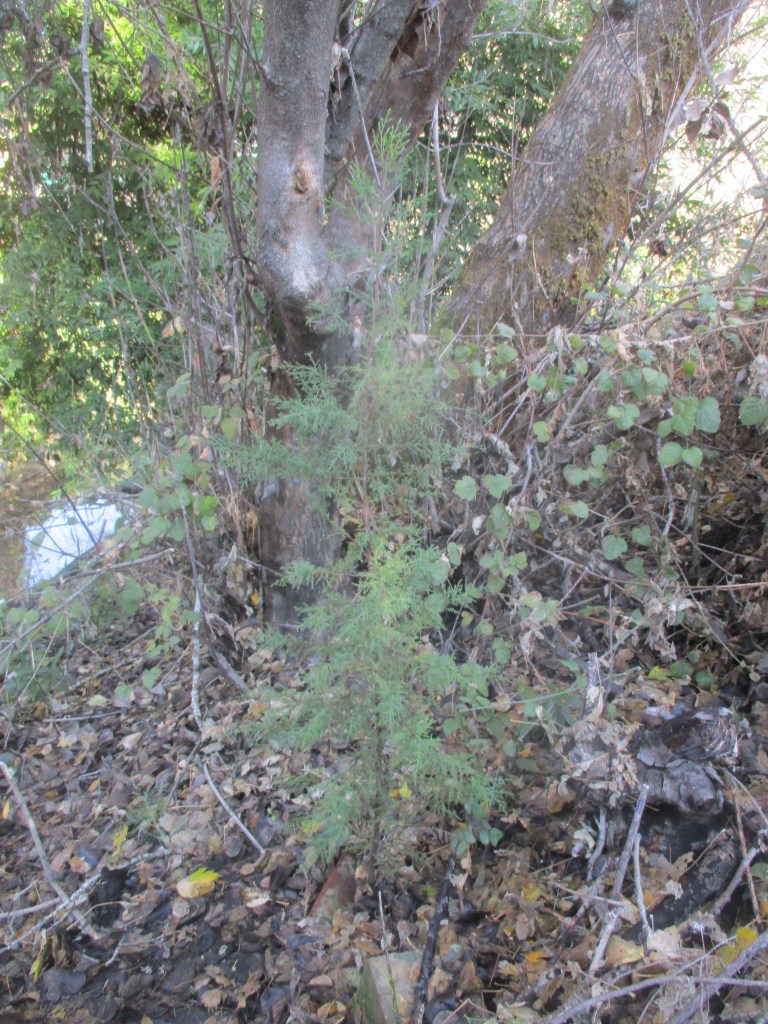 These three young Monterey cypress trees of the Memorial Grove have been doing quite well. Consequently, there is not much to write about them. Two were installed scarcely more than a year ago. The other was installed about two and a half years ago. All three were dinky seedlings when installed, so are less demanding than larger specimens would have been as they dispersed their roots to get established. Although still young, small and vulnerable, their only minor difficulty has been the partial shade of larger endemic box elder and cottonwood trees that have not yet been pruned for clearance. Such pruning has been delayed until the new trees become established, which they seem to have been doing quite efficiently. Although they lack supplemental irrigation, they would likely appreciate increased exposure to sunlight more than shelter from potentially desiccating warm breezes. I intend to increase clearance for the oldest of the three trees this winter for next year. I should do the same for the other two trees by next winter. Adjacent vegetation will subordinate to these three trees as they mature. They are only rarely irrigated by bucket and even more rarely fertilized. Lack of irrigation promotes deeper root dispersion. Since they are a nearly native species from Carmel, they actually require no assistance now that their roots are adequately dispersed. Unfortunately, I did not get good pictures of any of the trees.